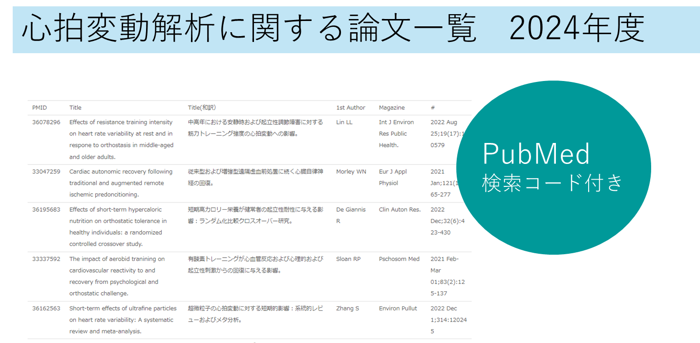 心拍変動解析に関連する論文の一覧です。ご興味のある論文がありましたらPMIDの番号でもPubmedで検索できます。研究のヒントなどにご活用ください。 PMID Title Title(和訳) 1st Author Magazine # 36078296 Effects of resistance training intensity on... -