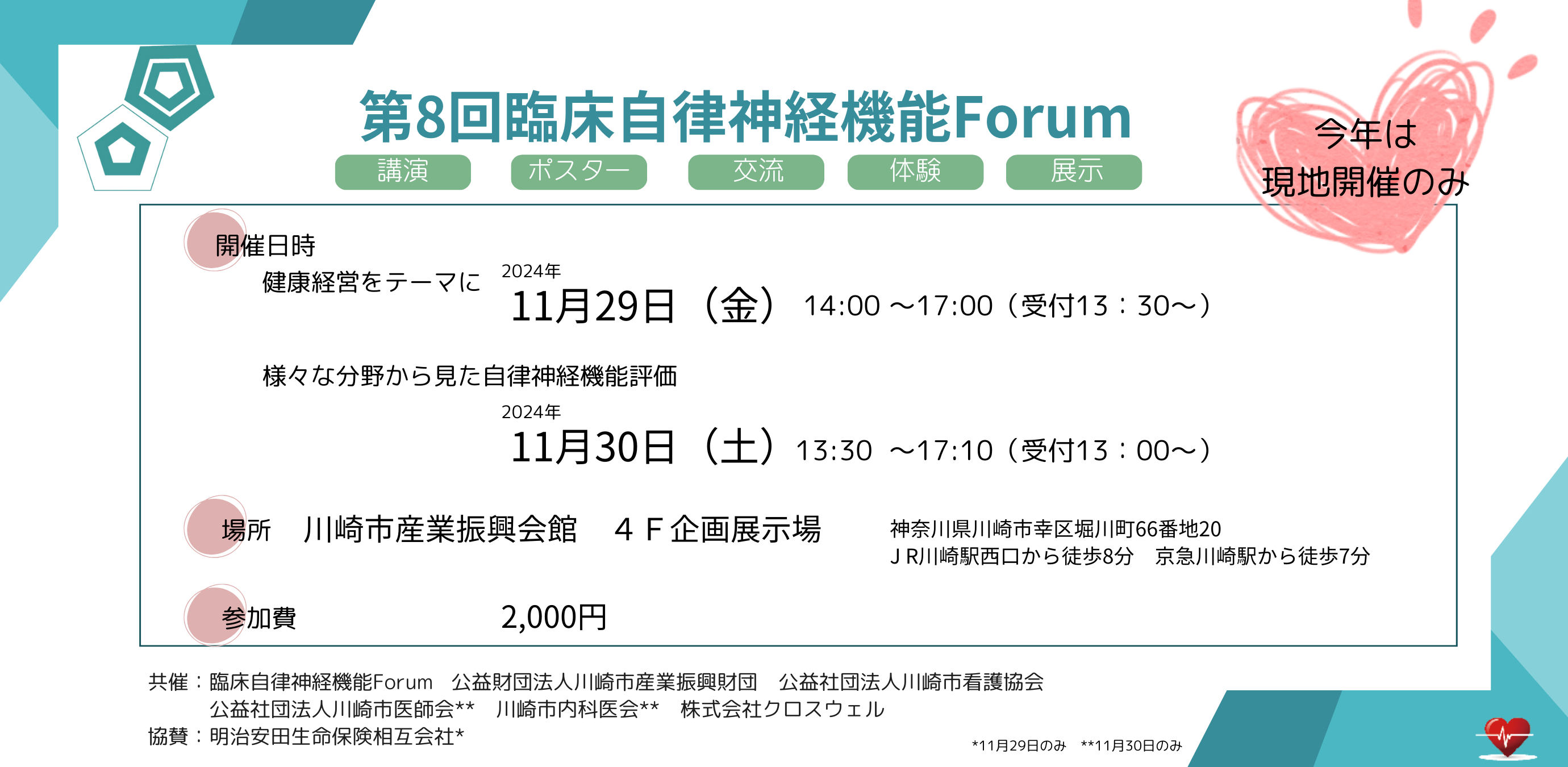 今年で8回目の開催となりました臨床自律神経機能Forumですが、今回はこれまでの医療従事者、研究者の方を対象とした内容と、新たに、健康経営と自律神経というテーマで企業・健康経営に興味のある方を対象とした内容を2日間にわたり開催しました。多くの皆... -