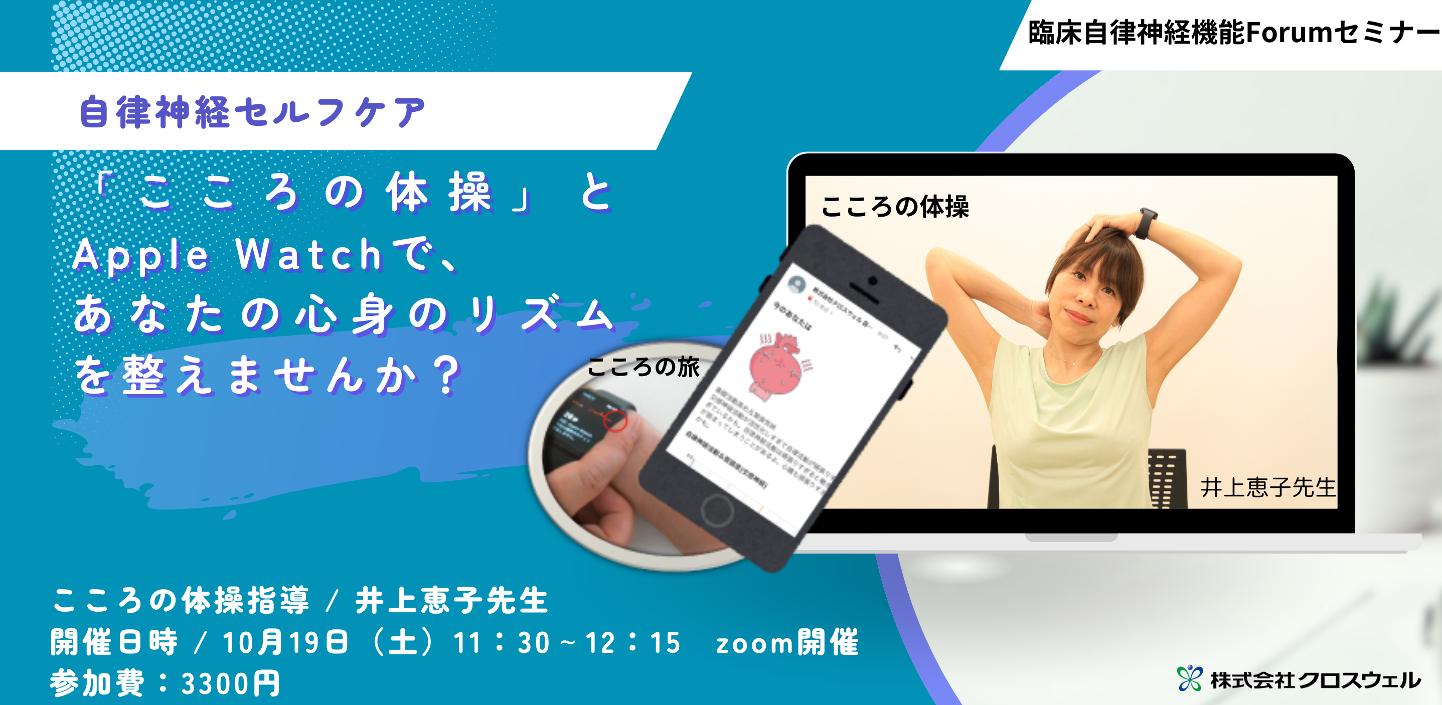 10月19日(土)11:30~12:15、zoomで有料オンラインセミナーを開催します。当日zoomでの参加が難しい方でも、期間限定でセミナー動画をご覧いただけます。AppleWatch(ECG付き)・Lacenaband3をお持ちの方は2024年12月31日まで「こころの旅」を無料で体... -